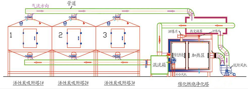 本工藝流程為:吸附濃縮——解吸脫附——催化燃燒的工藝流程。采取單氣路工作方式,由3個活性炭吸附器,一個催化燃燒器(輔之低壓風機、閥門等構成)。廢氣經預處理除去粉塵、顆粒狀物質后,送入活性炭吸附器1,當活性炭吸附器A接近飽和時,首先將處理氣體自動切換到活性炭吸附器2(活性炭吸附器A停止吸附操作),然后用熱氣流對活性炭吸附器1進行解吸脫附,將有機物從活性炭上脫附下來。在脫附過程中,有機廢氣已被濃縮濃度較原來提高幾十倍,達2000ppm以上,濃縮廢氣送到催化燃燒設備裝置,被成為CO?與H?O排出。